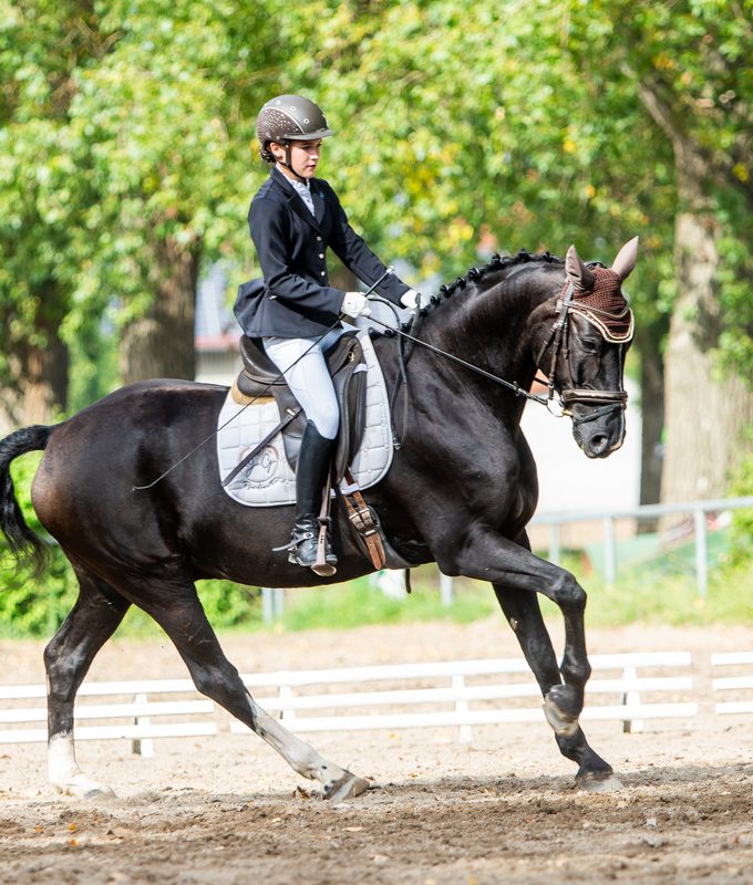 Während meiner Ausbildung zur Pferdewirtin, wurde der von Bruno selbstgezogene Wallach zum Reitpferd ausgebildet. Es stellte sich heraus, dass er für das angestrebte Zuchtziel, den Sport und die Boxenhaltung nicht geeignet war und so zog er 2012 zu uns in den Offenstall. Seit dieser Haltungsoptimierung und entsprechender Entlastung unter dem Sattel, beglückt er mich bis heute mit seiner verschmusten Art und geht für mich durch dick und dünn. Auch er schulte die etwas Größeren und in der Reiterei weiteren jüngeren Erwachsenen; so konnte meine kleine Schwester mit ihm ein bisschen Turnierluft schnuppern und einige Erfolge in der Einsteigerklasse erzielen. Seit 2017 unterstützen Rudi und ich die Stadt Bingen bei den Martinsumzügen mit Reiter und Pferd und lassen so einige Kinderherzen höherschlagen.